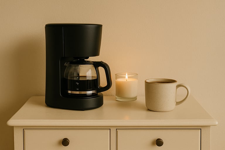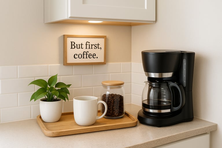 Add a small tray with your coffee maker, a jar of beans or grounds, your favorite mug, and maybe a plant or two. A small lamp or under-cabinet light can give it that cozy, early-morning glow.